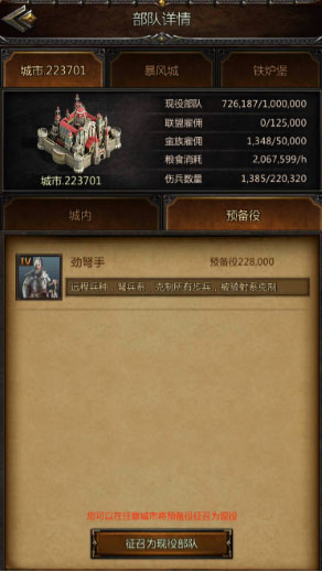 当正规军有缺额时可花费少量的时间征召成为正规军,预备役可从自己的任意城市进行征召。