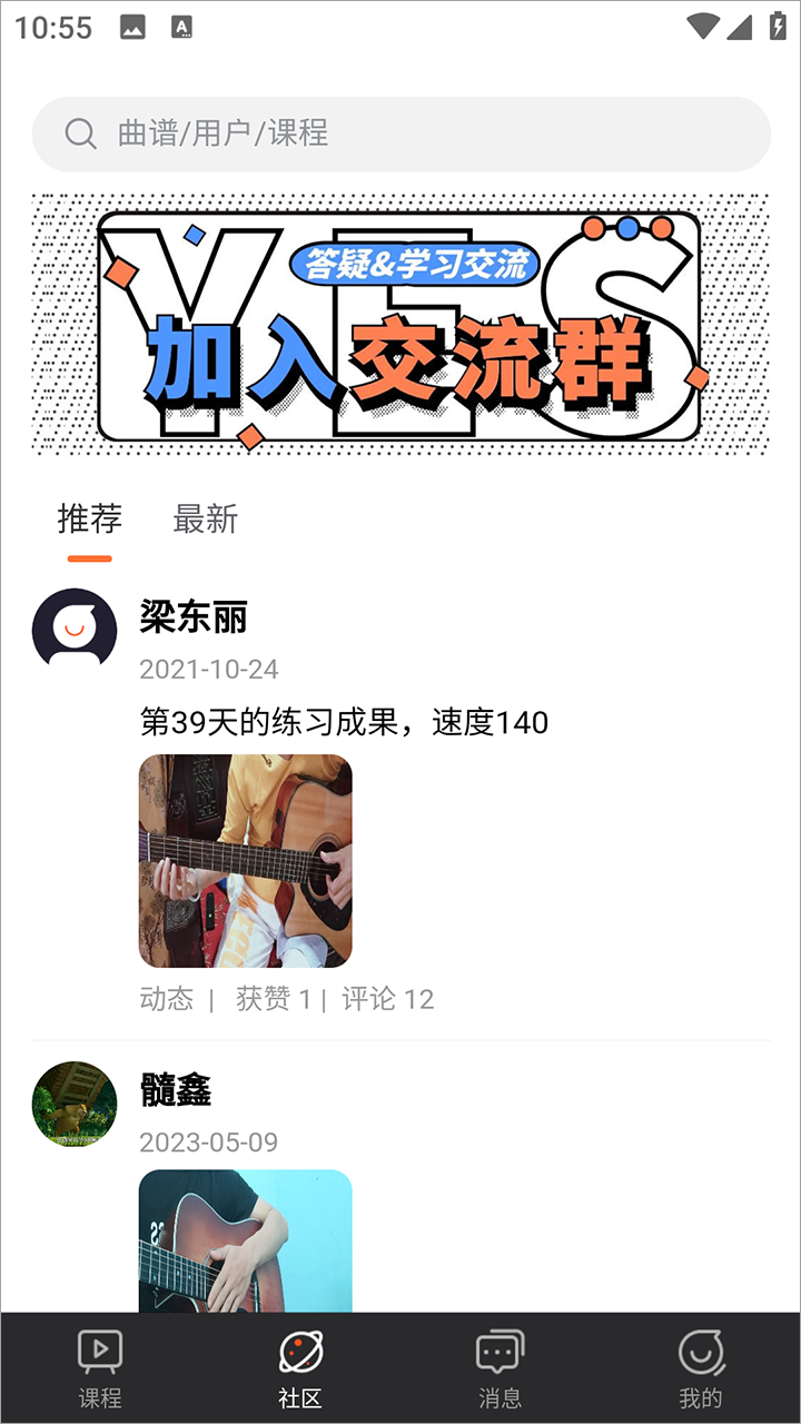 4、在社区页面,可浏览其他学琴者动态,共同交流进步。