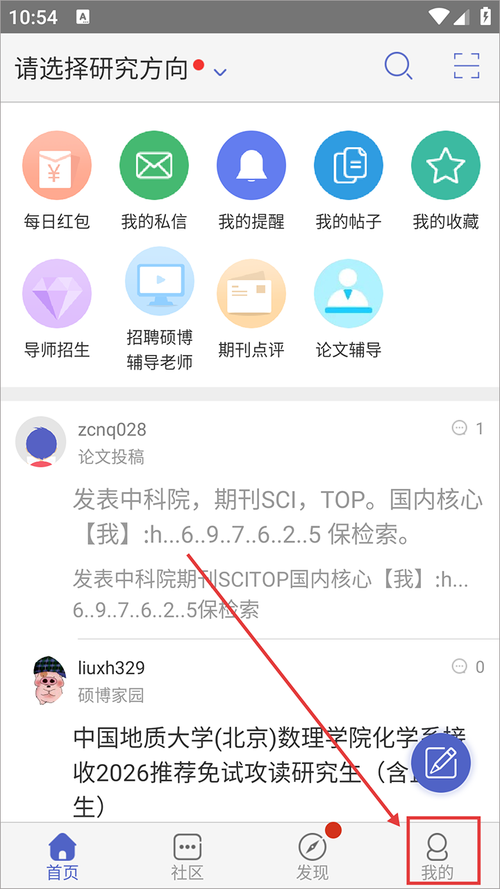 1、在本站下载安装app,打开小木虫论坛手机版软件后,点击我的;