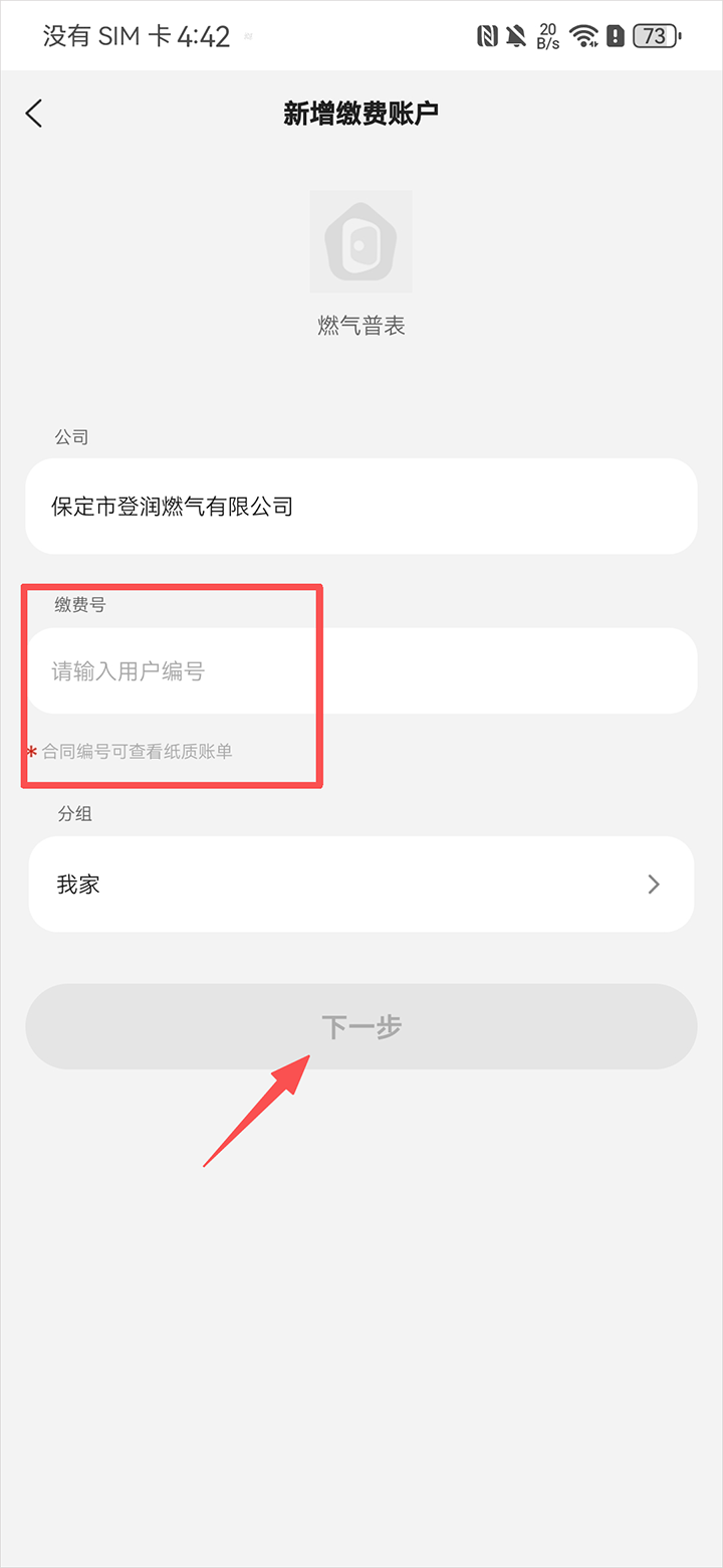 4、将纸质账单上的合同编号填写完成就点击下一步