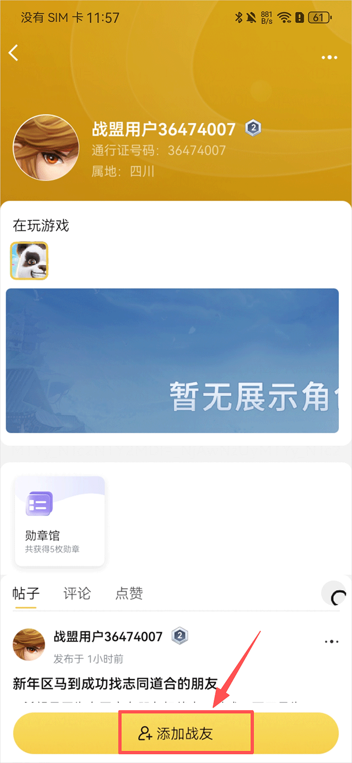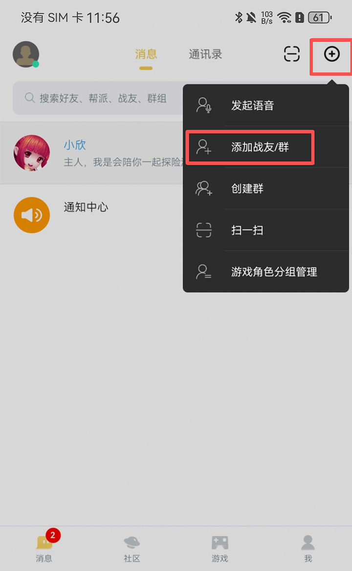 1、在app消息界面内点击右上角+号,再点击添加战友