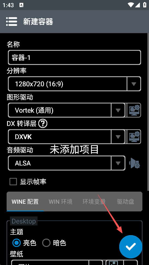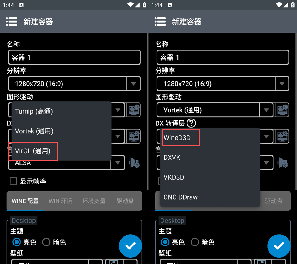 3、如果你是天玑麒麟等处理器,在图形驱动选择VirGL也就是通用驱动,图形加速选WineD3D其余保持默认 完成后点击√即可创造容器
